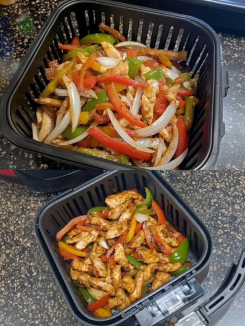 Air fry for 12–15 minutes, shaking halfway through, until chicken is cooked through (internal temp 165°F) and veggies are slightly charred.