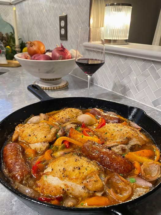 A hearty one-pan dish where pan-seared chicken and Italian sausage are braised with bell peppers, pickled cherry peppers, garlic, onions, and a sharp, savory white wine vinegar sauce. It’s a comfort food classic, perfect served with roasted potatoes, pasta, or crusty bread to soak up the sauce.