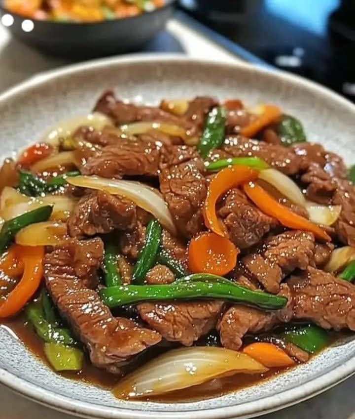 Thinly sliced beef stir-fried with onions in a rich, soy-based sauce. It’s a classic Chinese takeout favorite, simple enough to make at home in under 30 minutes.