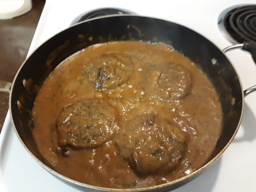- Return the hamburger steaks to the skillet with the gravy, spooning some of the gravy over the patties. Let them simmer in the gravy for 5 minutes, allowing the flavors to meld together.