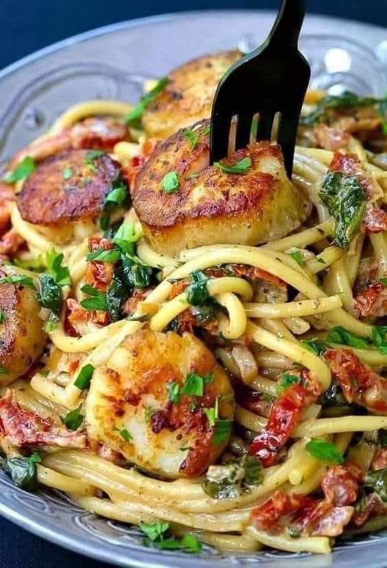 Creamy Tuscan Spaghetti with Jumbo Scallops is a rich, flavorful dish that combines the creamy goodness of a Tuscan-style sauce with perfectly seared jumbo scallops and pasta. The sauce typically features garlic, sun-dried tomatoes, spinach, and cream, creating a mouthwatering contrast with the delicate scallops.