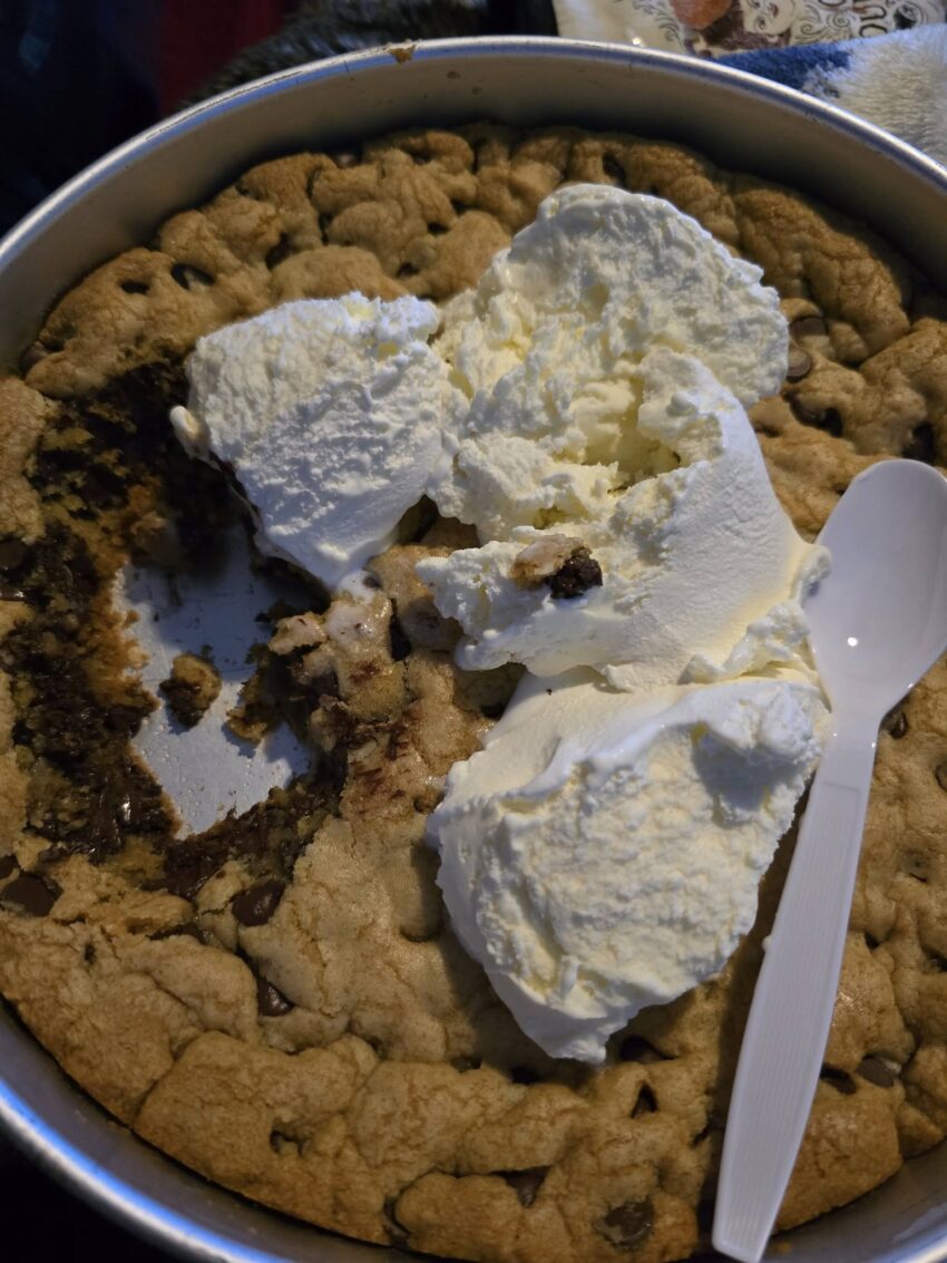 - Let the cookie cool in the pan for 10-15 minutes. If you like it extra gooey, serve while it’s still warm!