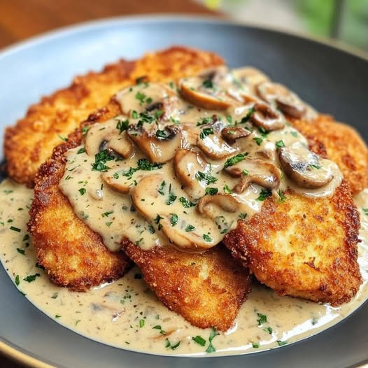 Enjoy your Golden Crispy Chicken with Mushroom Parmesan Sauce—a comforting, flavorful dish that’s sure to be a hit!