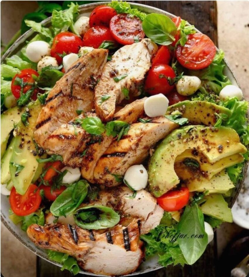 Grilled Chicken Salad with Avocado and Mozzarella is a refreshing and filling salad that combines tender grilled chicken, creamy avocado, and fresh mozzarella, all tossed with a light dressing. It’s perfect for a healthy lunch or a light dinner. Here’s how to make it: