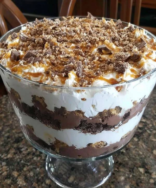 Layers of fudgy brownies, chocolate pudding, whipped cream, and crushed candy or cookies—soft, crunchy, creamy, and pure indulgence.