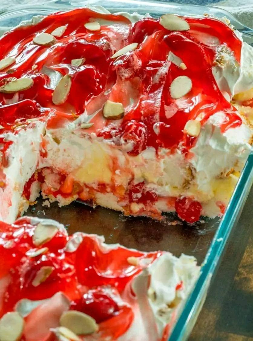 Finish and serve: Just before serving, spoon the remaining cherry pie filling on top. Add slivered almonds or other garnishes if desired.