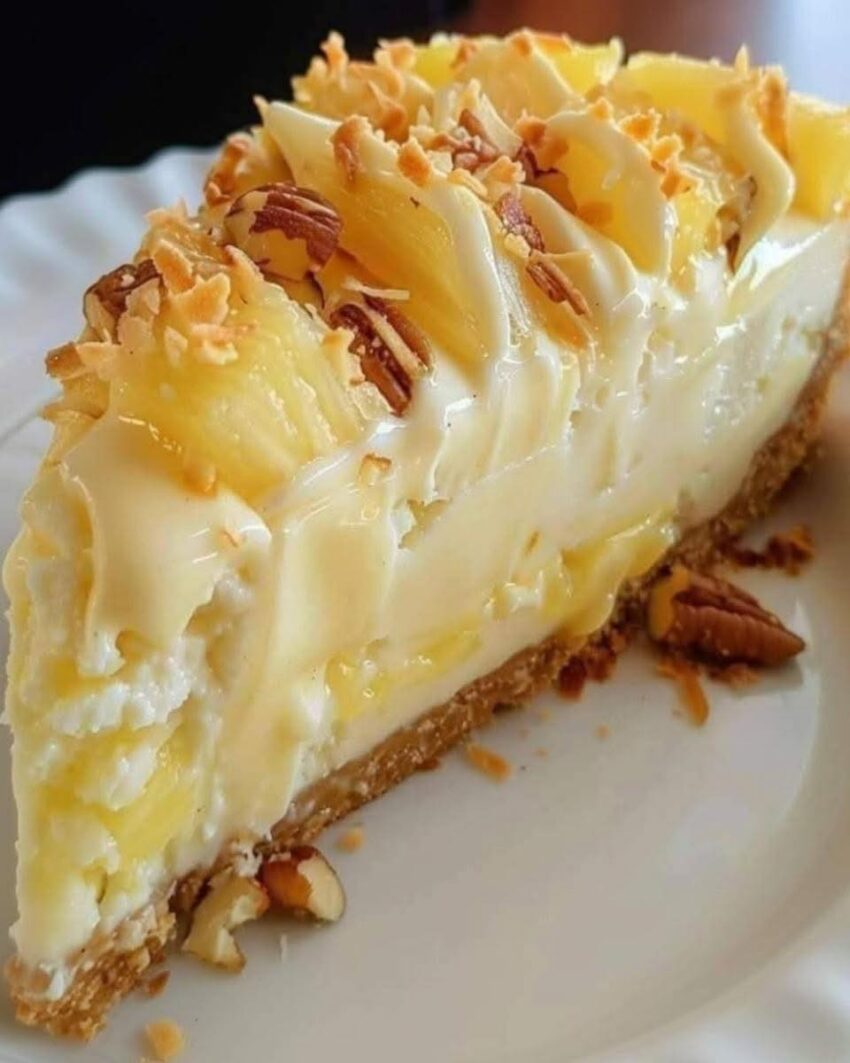A buttery graham cracker crust filled with a fluffy, lightly sweet cream cheese and crushed pineapple filling—chilled until firm and topped with more pineapple or whipped cream.