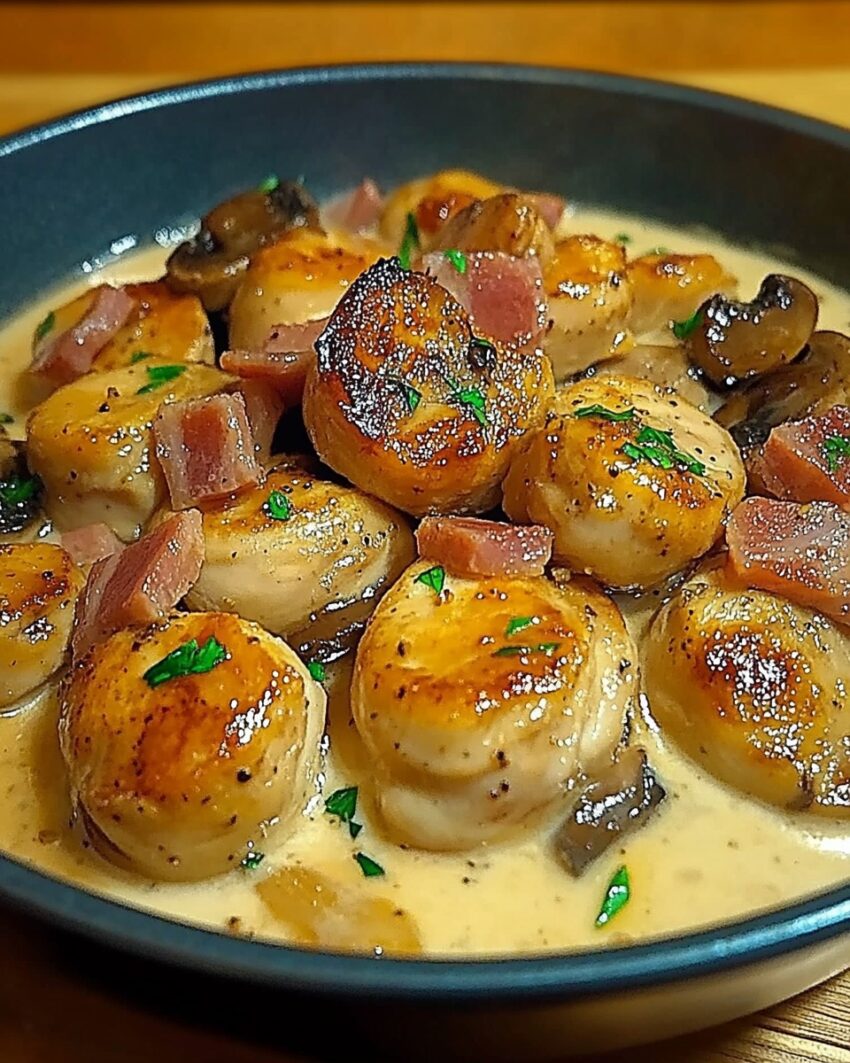 Voici une délicieuse recette de Poulet crémeux aux champignons et bacon, un plat riche et savoureux parfait pour un dîner réconfortant :