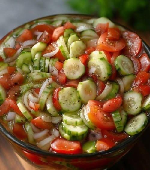 Here’s a super simple, crisp, and refreshing marinated cucumber, tomato, and onion salad β€” perfect as a summer side dish, picnic staple, or a light palate cleanser. πŸ₯’πŸ…πŸ§…
