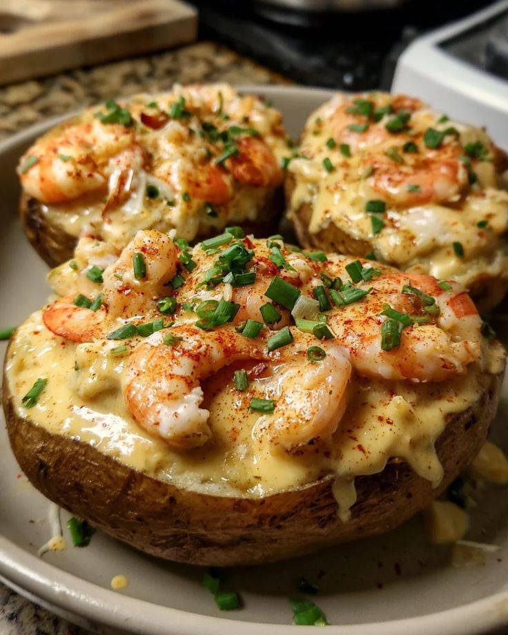 Baked potatoes filled with a creamy, cheesy seafood mixture — typically featuring shrimp, crab (or imitation crab), and sometimes scallops — then baked again until golden and bubbling.