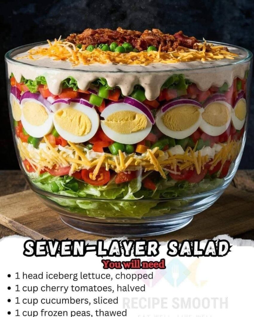 A Seven-Layer Salad is a colorful and hearty layered salad that’s perfect for potlucks, picnics, or just a delicious side dish to any meal. It’s made with fresh vegetables, cheese, and a creamy dressing, all layered for a visually stunning effect.