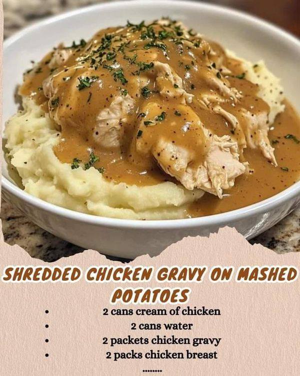 Hereβs a hearty, comforting recipe for Shredded Chicken with Gravy on Mashed Potatoes β tender, juicy chicken simmered in a savory homemade gravy, spooned over creamy mashed potatoes. Itβs cozy, affordable, and perfect for weeknight dinners or lazy Sundays.