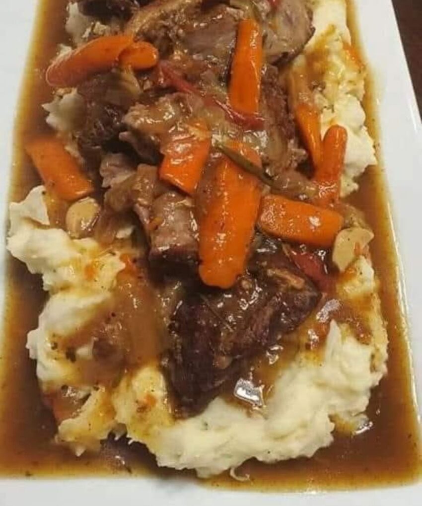 Here’s a classic, comforting recipe for Slow-Cooked Pot Roast with Creamy Mashed Potatoes—fall-apart tender beef in rich gravy, served over smooth, buttery mashed potatoes. Perfect for Sunday dinners or cozy gatherings.