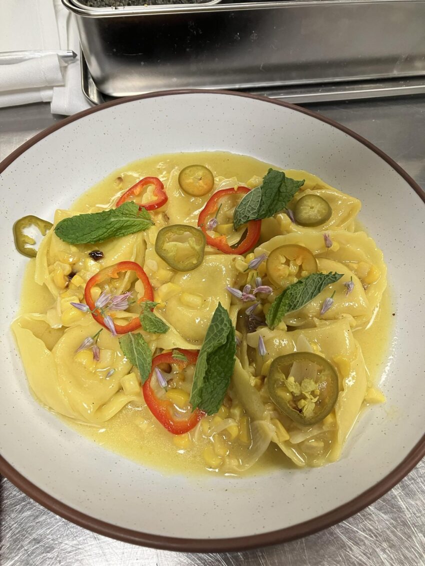 Enjoy your Sweet Corn and Ricotta Cappelletti with pickled chili!
